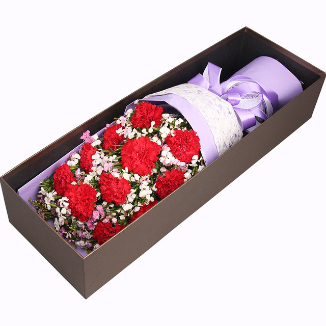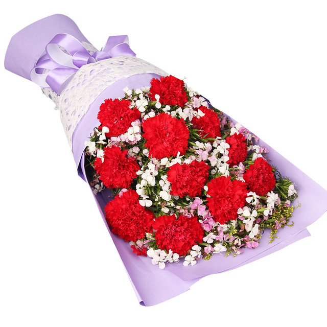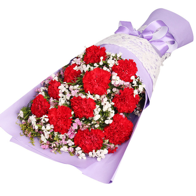 - 花材:11朵红色康乃馨,相思梅、黄莺