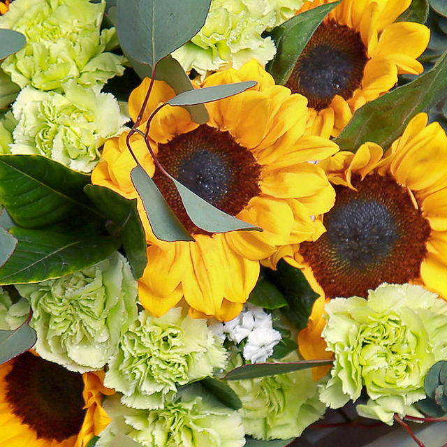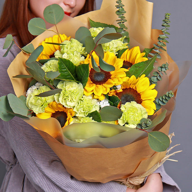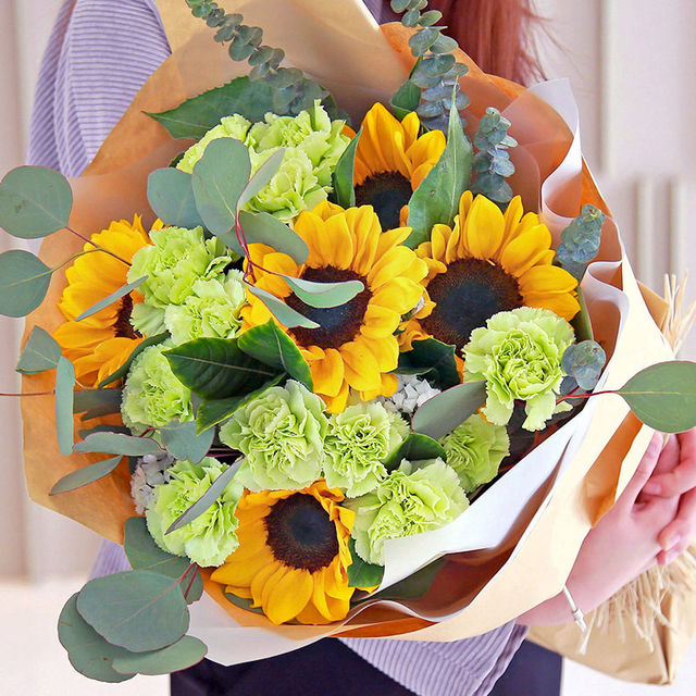 6朵向日葵,尤加利叶、绿色康乃馨、相思梅
