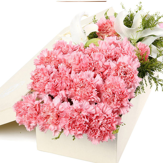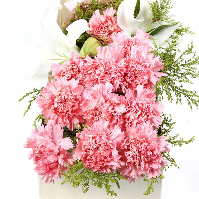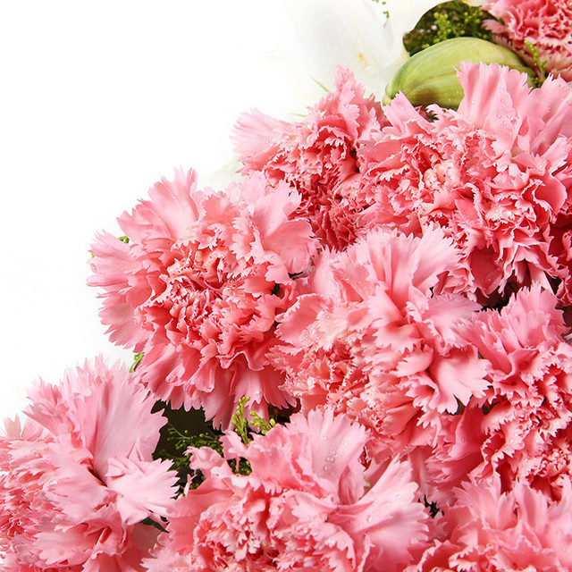 - 花材:19枝粉色康乃馨,1支香水百合,黄莺